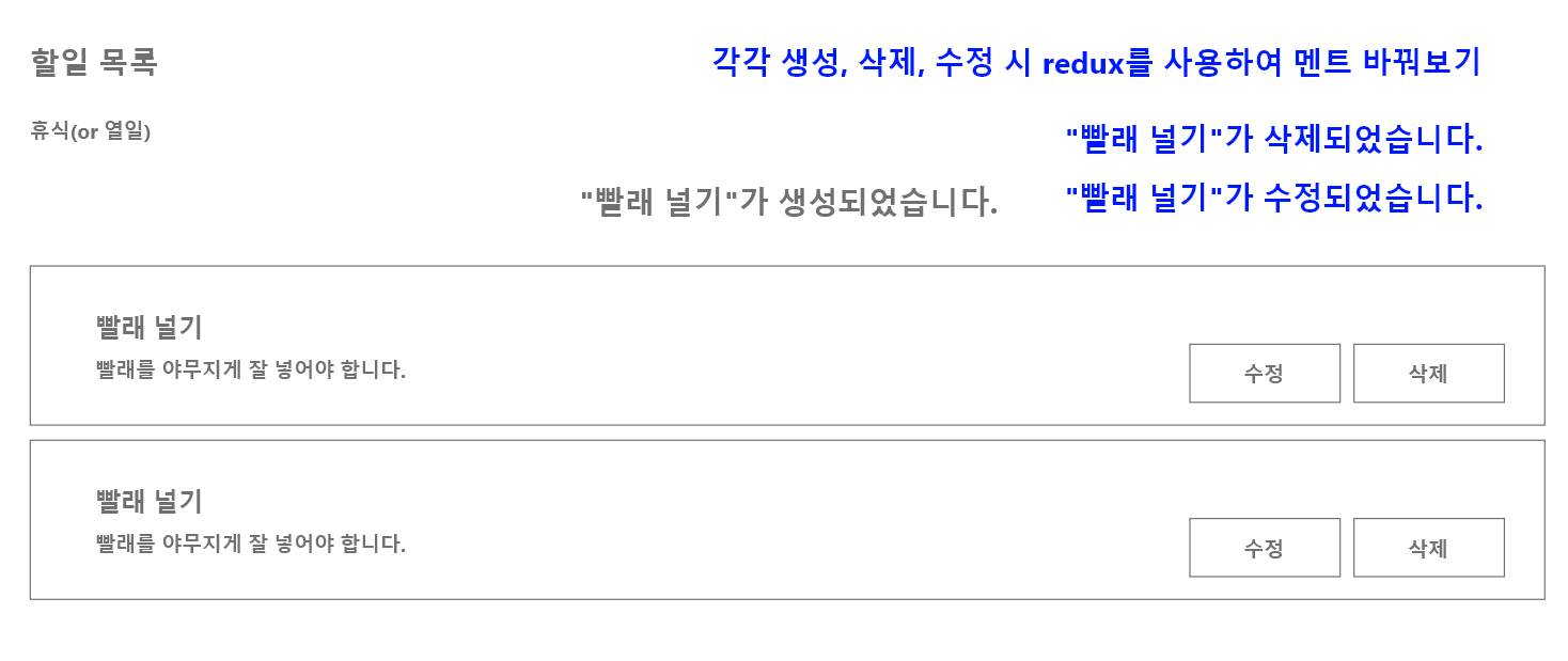 - 할일 목록 생성, 수정, 삭제 시 redux를 이용하여 각각에 따른 멘트 노출해보기