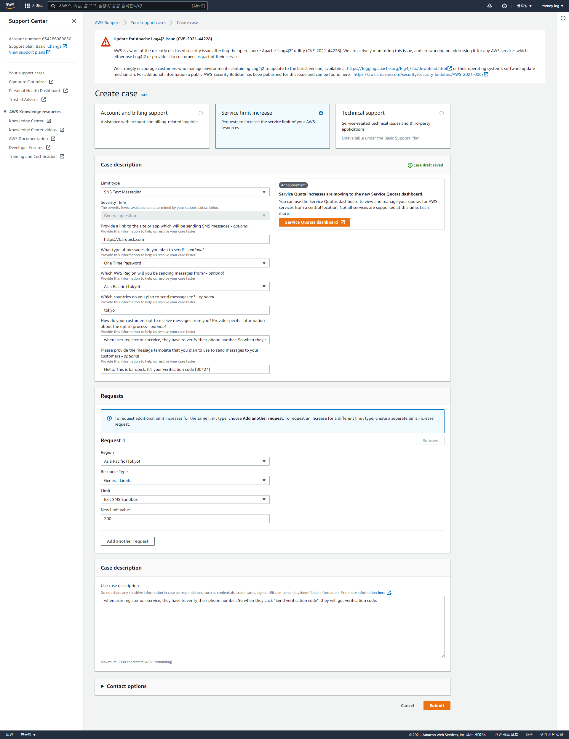 -> 한도 추가되면 계정지출한도 늘려야돼(안그러면 메세지 몇개 못보내)